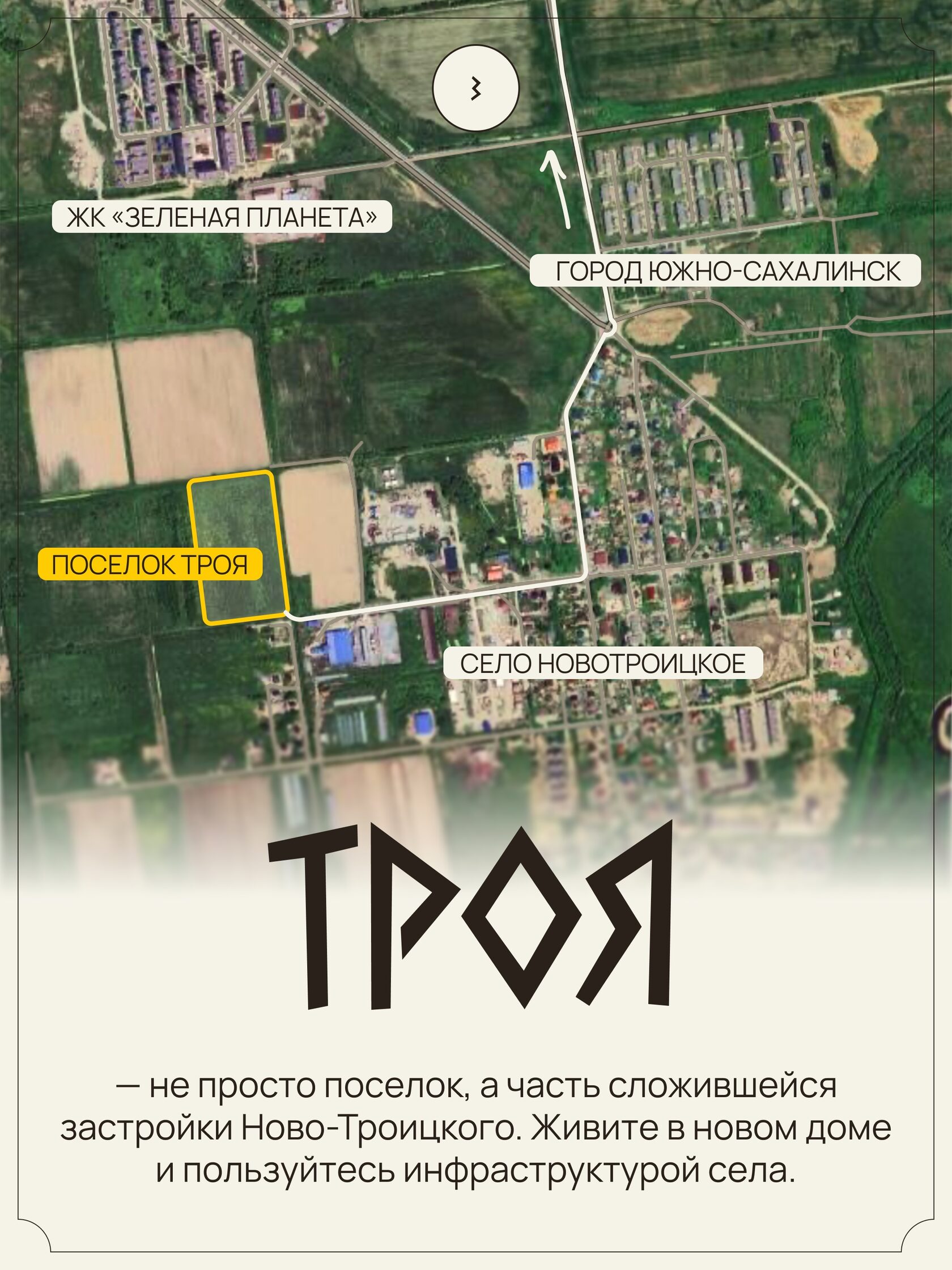 Поселок Троя состоит из 105 участков от 4 соток, примыкающих к Новотроицкому. Фактически это часть села с развитой инфраструктурой в шаговой доступности – магазинами, почтой, детсадом и т. д.